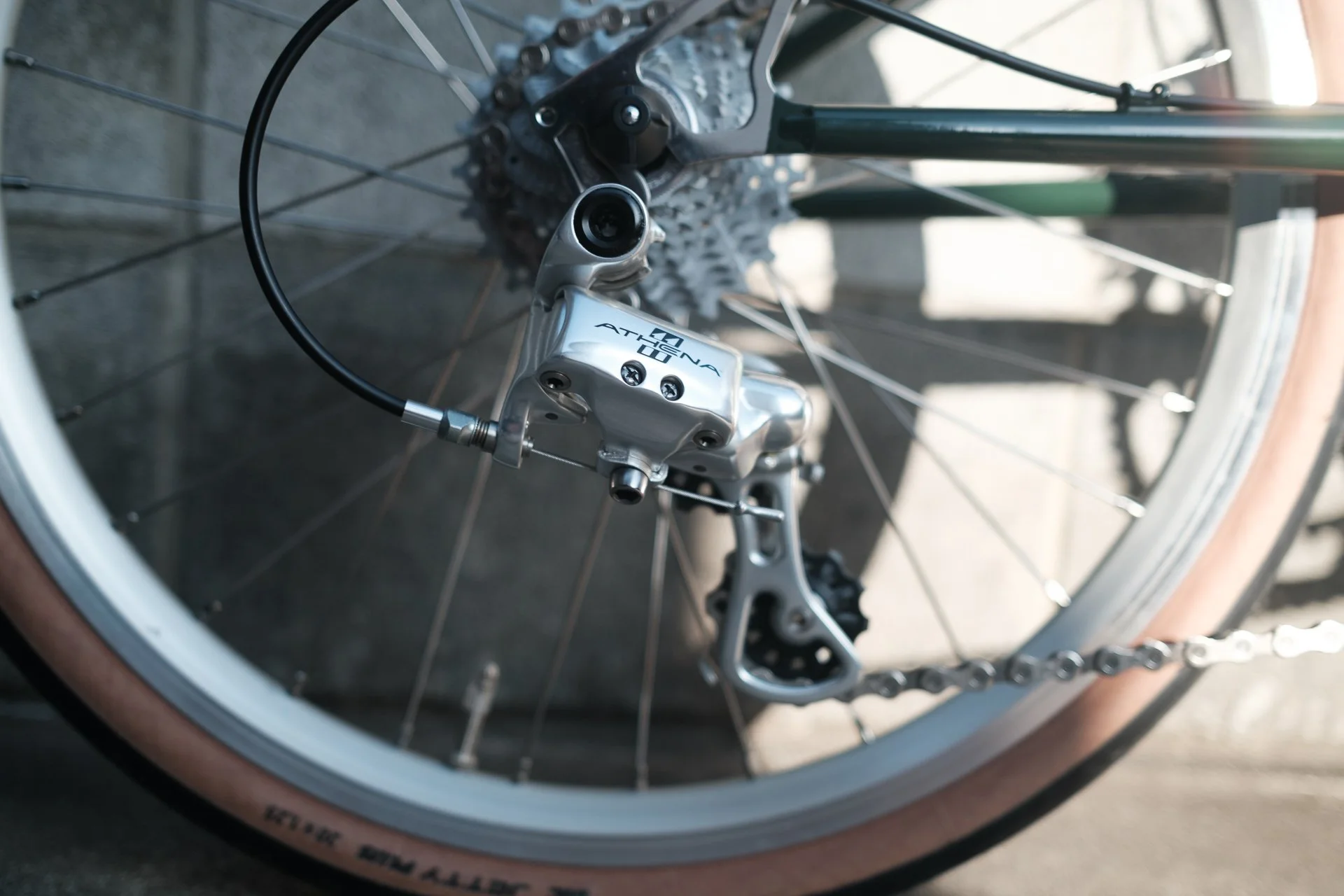 コンポはカンパニョーロ・アテナ。クロームのコンポは絶滅で、デッドストックのFD・RD・STIレバーを取り付け。